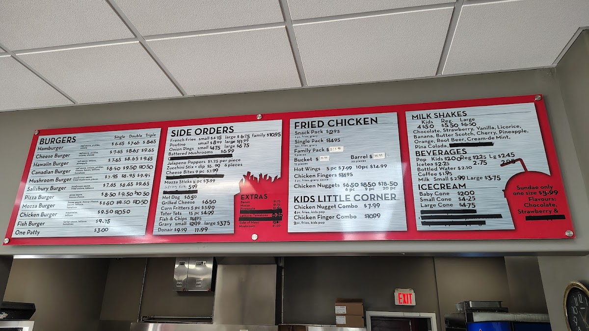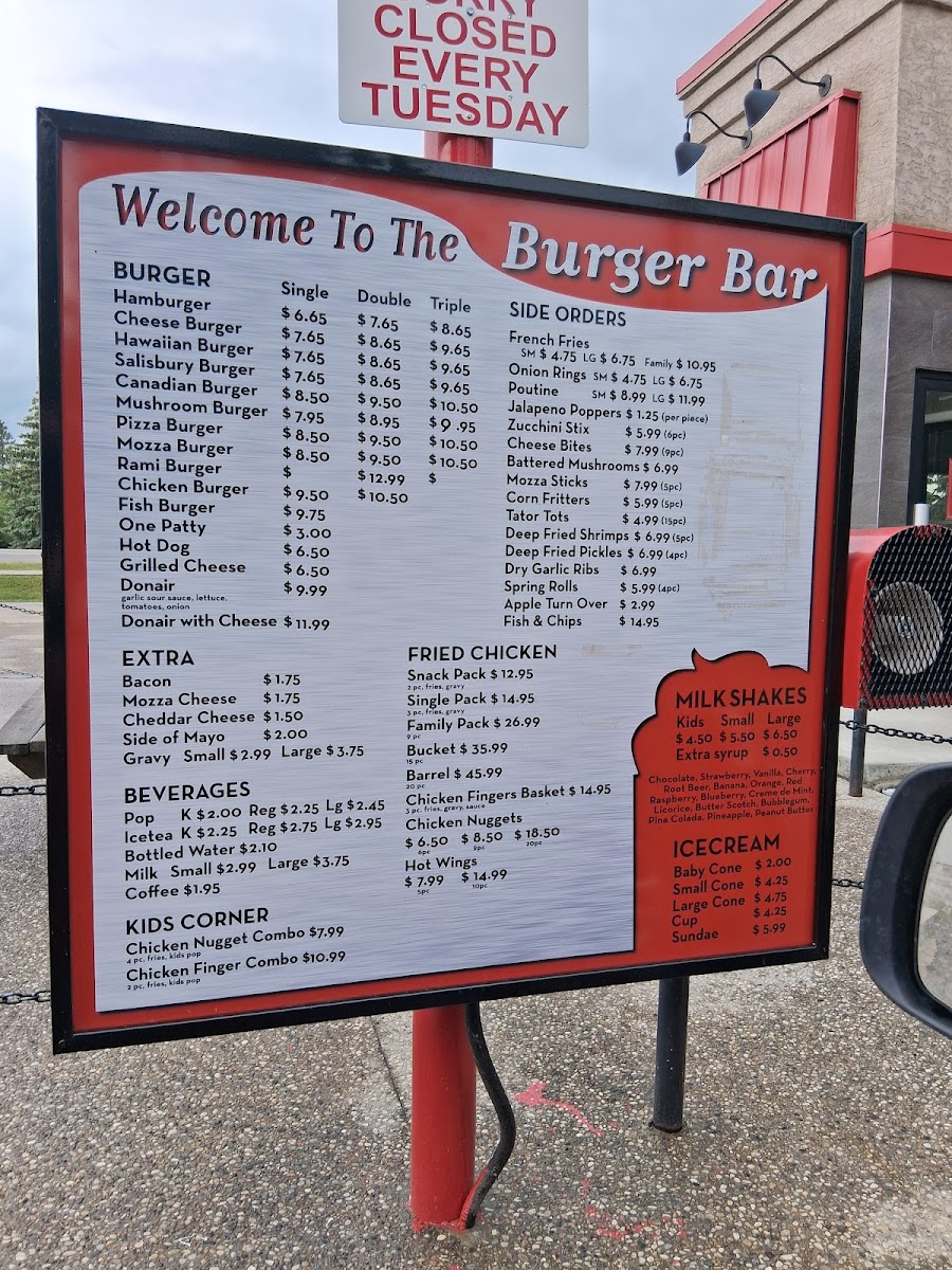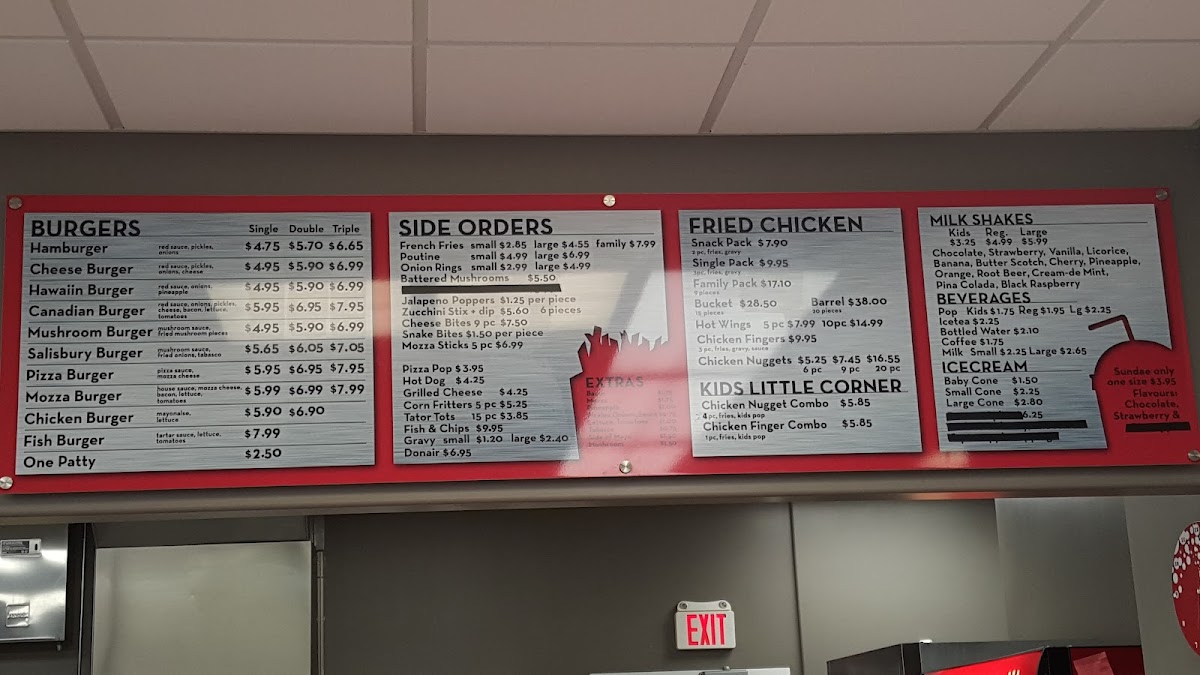 The menu features a variety of freshly prepared burgers, from simple cheeseburgers to more hearty options like the Canadian Burger or Mushroom Burger. Alongside these, you’ll find satisfying side orders such as crispy French fries, poutine, and corn fritters that pair well with any main dish.